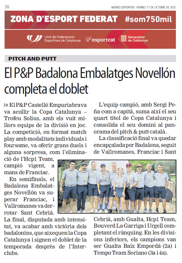 Dissabte tarda i diumenge al matí es van jugar les semifinals, el Badalona Embalatges Novellón va enfrontar-se a Franciac, mentre que Sant Cebrià Blau Casa Carlos ho feia contra Vallromanes. Els badalonins, campions del Campionat Interclubs 2025 i tricampions de la Copa Catalunya (2009, 2014 i 2022), van arribar de nou a la final, aquest cop contra l’equip de Vallromanes. Després d’un gran nivell de joc el P&P Badalona Embalatges Novellón es va proclamar campió de la Copa Catalunya – Trofeu Solius 2025, guanyant per 3 i aconseguint així el doblet en les competicions per equips d’aquesta temporada. Els integrants de l’equip campió són: Sergi Peña (capità), Elia Folch, Berenguer Ortí, Jose Posilio, Salvador Moreu, Manuel Amor, Lluís Belmonte, Carlos Vilardell, Jose Manuel Pascual, Juan Carlos Martínez, Santi Novellón