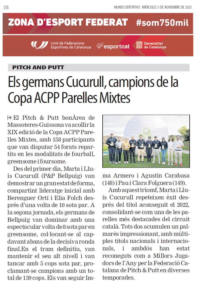 El cap de setmana de Tots Sants, del 31 d’octubre al 2 de novembre, es va celebrar la XIX edició de la Copa ACPP Parelles Mixtes al Pitch & Putt bonÀrea a Massoteres-Guissona. Aquesta competició per parelles reuneix les tres modalitats de joc més habituals: fourball (cada jugador/a juga la seva bola i puntua el millor resultat), greensome (cada jugador/a fa un cop de sortida, s’escull una bola i després es fan cops alternatius) i foursome (cada jugador/a colpeja alternativament la mateixa bola).