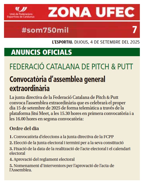 La Junta Directiva de la Federació Catalana de Pitch & Putt convoca l’Assemblea Extraordinària que es celebrarà el proper dia 15 de setembre de 2025, de forma telemàtica a través de la plataforma Jitsi Meet, a les 15:30 hores en primera convocatòria i a les 16:00 hores en segona convocatòria.